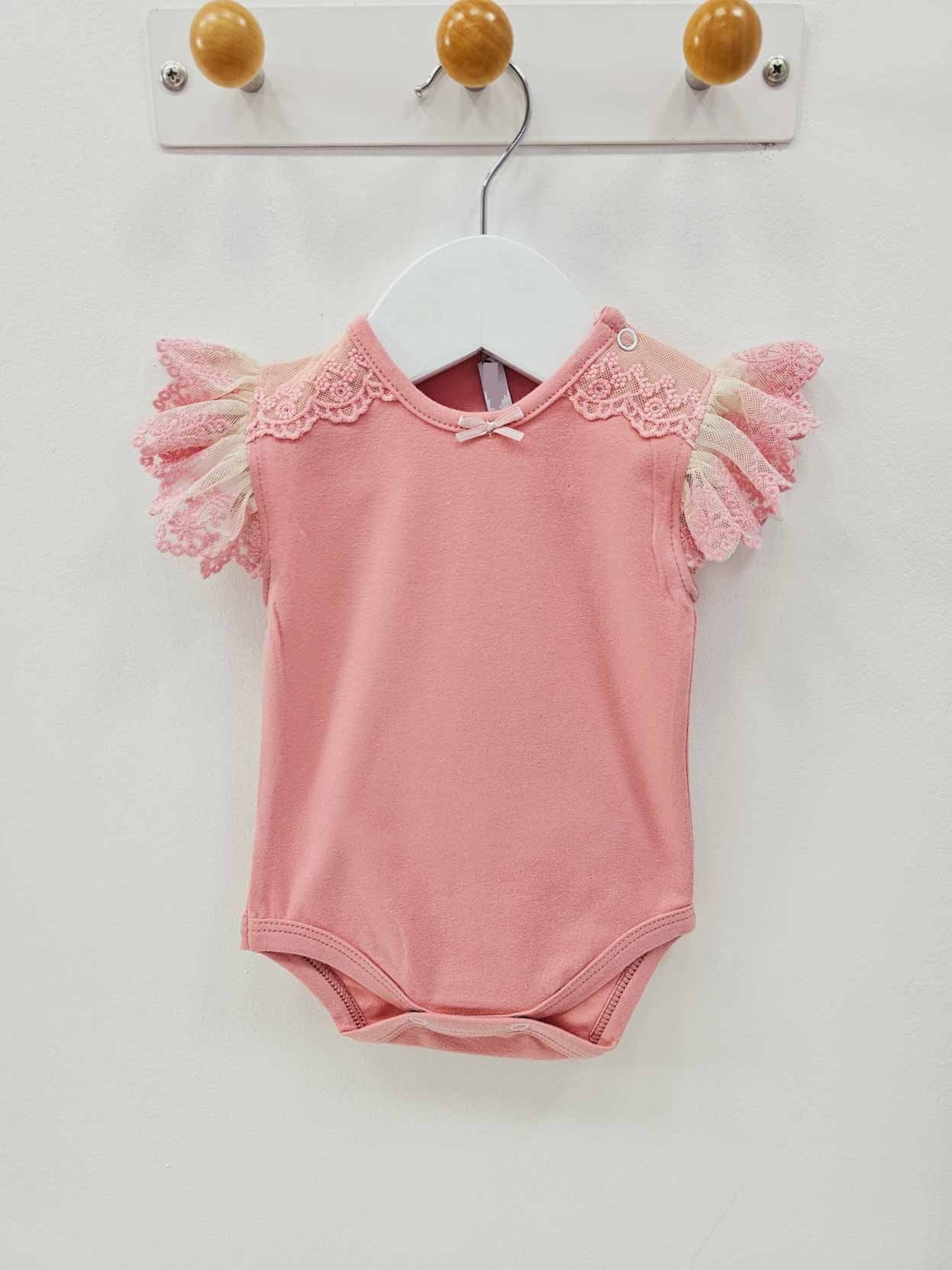 Este hermoso body, confeccionado jersey suave elastizado vine con apliques de puntilla de tul al tono en mangas y hombros, un botón perlado para abrir el cuello y dos broches pañaleros.
